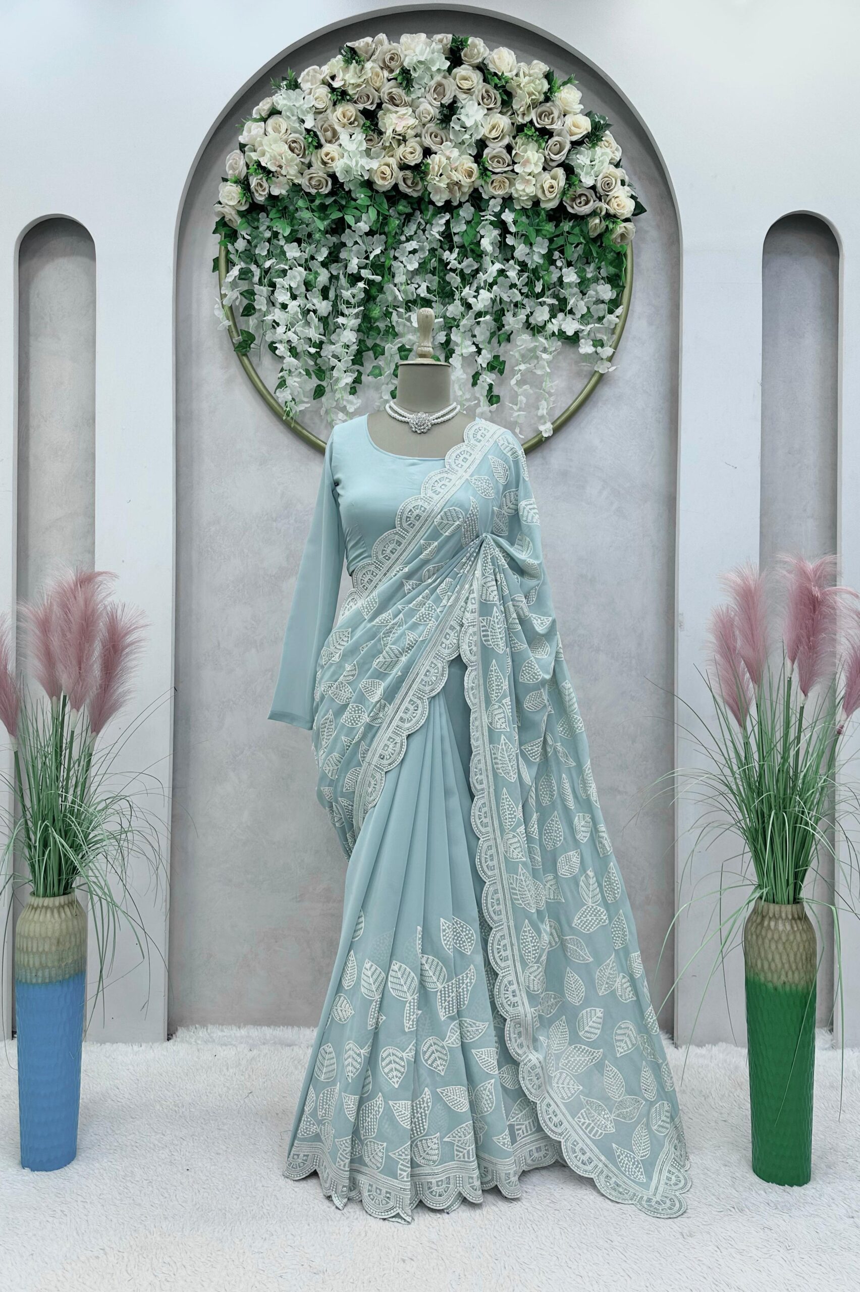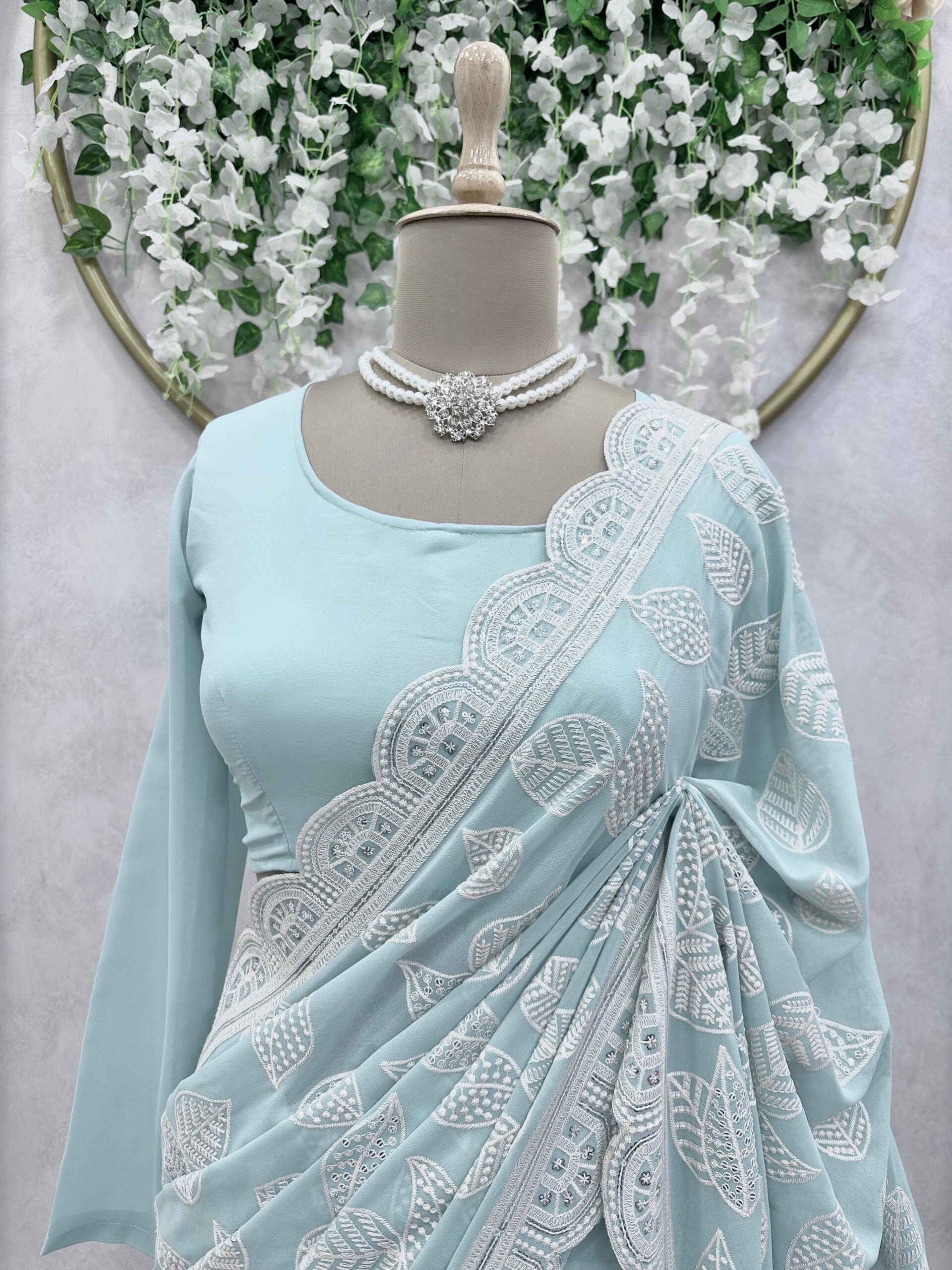 Dreaming of a saree that blends effortless grace with dazzling details? Meet your match! Women Groves presents this stunning Faux Georgette saree – perfect for weddings, parties, or adding sparkle to everyday moments.